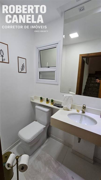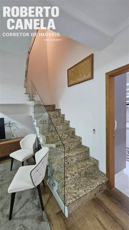 No pavimento inferior, você encontra uma sala ampla para dois ambientes, lavabo e cozinha planejada integrada à área de serviço.